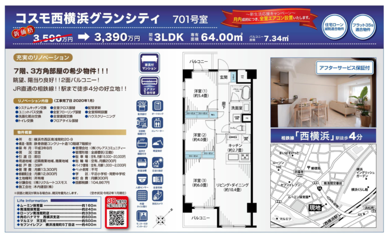 7階部分、西・南・東の3方角部屋に位置するため、日当たり通風、共に良好でございます。相鉄線「西横浜」駅徒歩4分、平坦な道のりですので、負担も少なく、ターミナル駅の横浜までも2駅でアクセスできる点も魅力のひとつではないでしょうか。