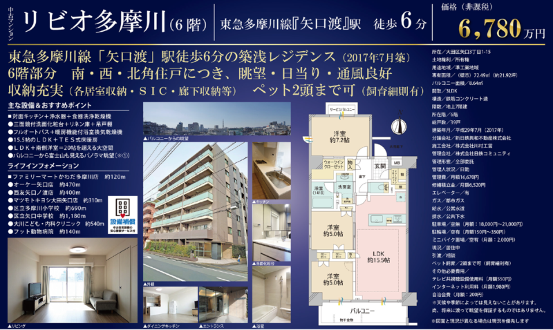 6階部分、西・南・北の3方角部屋に位置するため、日当たり通風、共に良好でございます。東急多摩川線「矢口渡」駅徒歩6分、平坦な道のりですので、負担も少なくアクセス可能です。